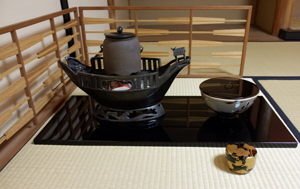 広間の掛け軸は都千家のルーツである江戸千家・川上不白筆「竹画讃」、風炉は船形で享保年代の希少なもの、3代目家元の船出を思わせる一品であり、一期一会の茶席の場に相応しいお道具立てでありました。