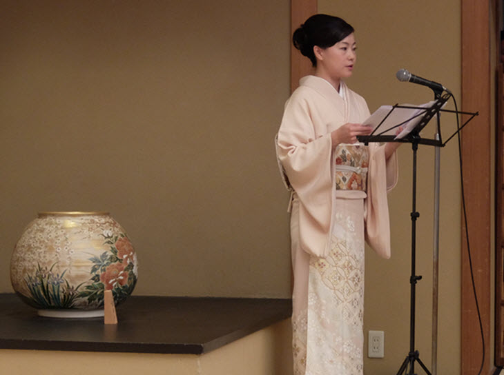 最後に新家元片山宗紗より挨拶がありました。この度の襲名を心待ちにしていた初代宗照のお弟子の方々、先生並びに参列者の皆様への感謝の気持ちと、茶道の伝統を受け継いで流派を盛り立てていく決意を語りました。「一期一会の出会いを大切にして、親しみのある温かい流派を目指していきたい。」と抱負を述べ
