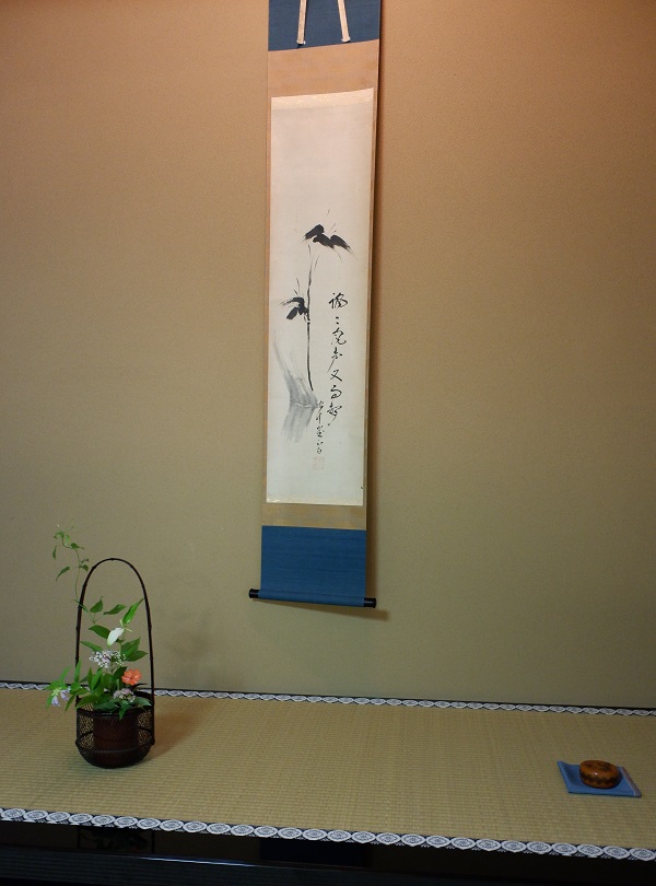 広間の掛け軸は都千家のルーツである江戸千家・川上不白筆「竹画讃」、風炉は船形で享保年代の希少なもの、3代目家元の船出を思わせる一品であり、一期一会の茶席の場に相応しいお道具立てでありました。